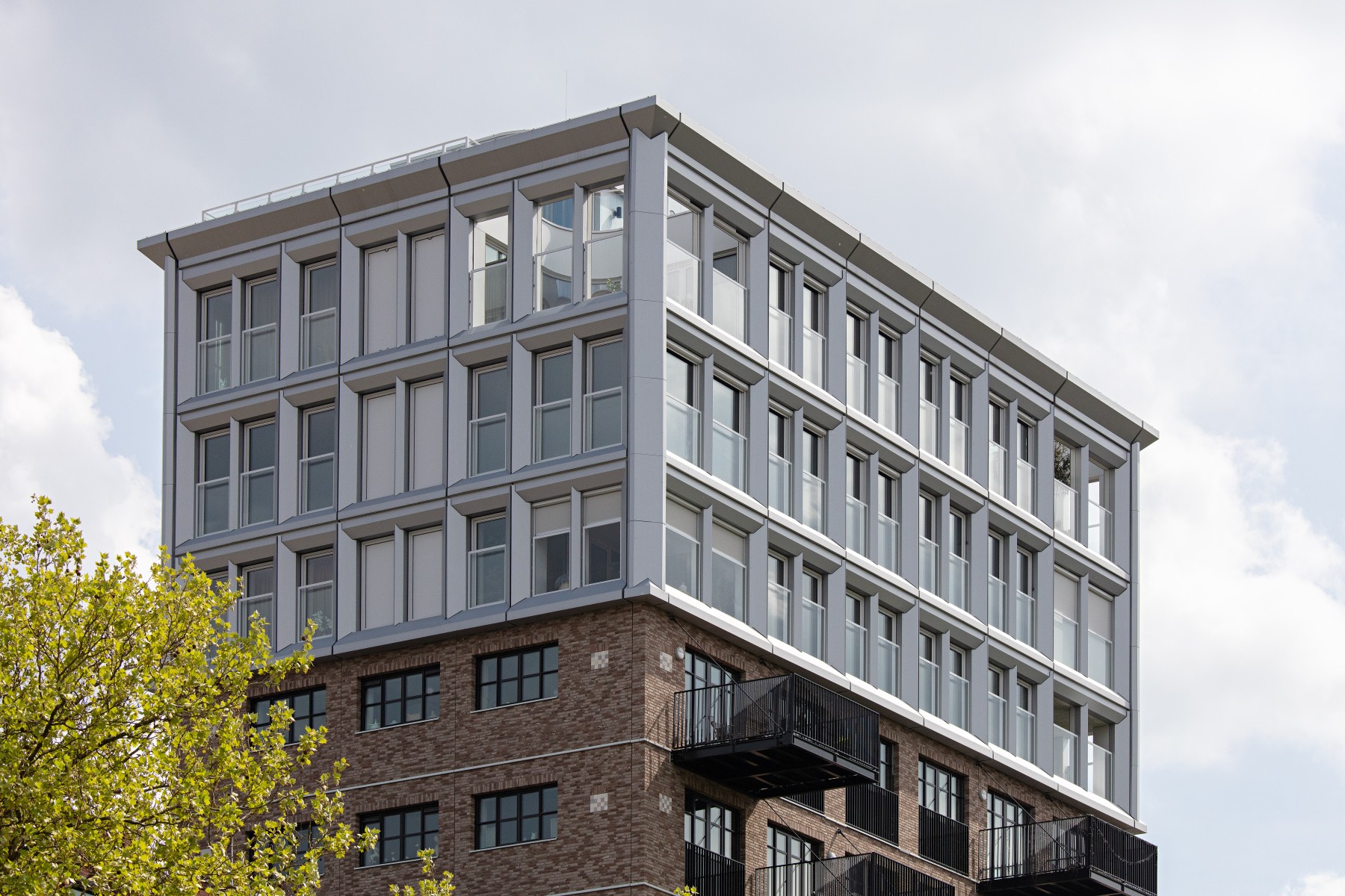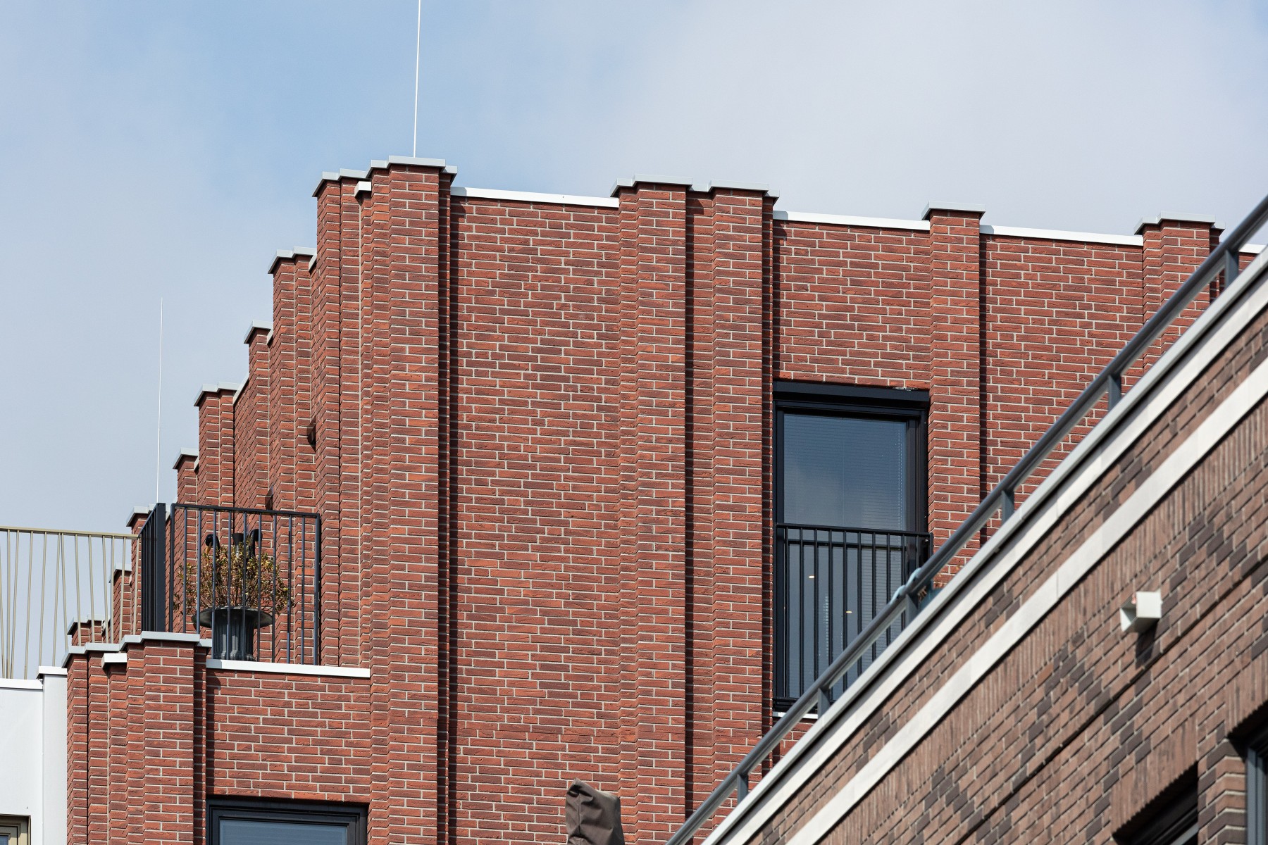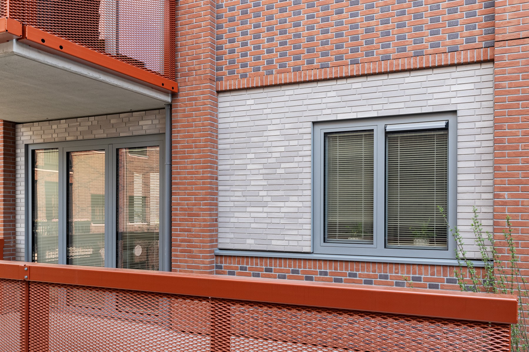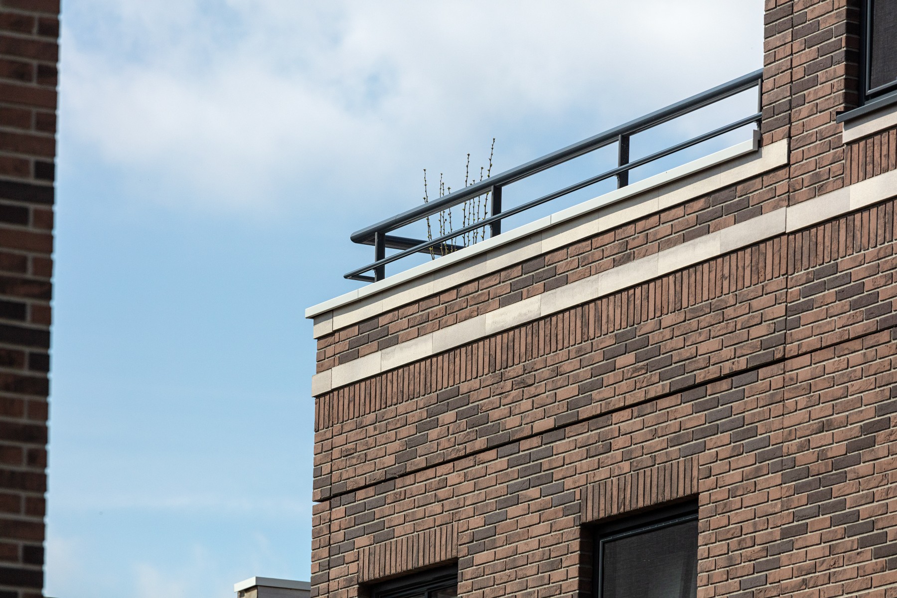Für die Wasserschläge und Mauerabdeckkappen wählte Joost bewusst Aluminium wegen der Leichtigkeit, mit der das Material detailliert werden kann. Die Aluminium-Mauerabdeckkappen sind an einigen Stellen mit Balustern mit Geländer versehen, manchmal drei übereinander. „Aluminium-Mauerabdeckkappen sorgen für eine saubere Oberfläche an Rändern, an denen Bewohner nah herankommen, wie Balkone und Dachterrassen. Hier ist Aluminium nicht nur ästhetisch ansprechend, sondern auch praktisch durch seine Langlebigkeit und einfache Wartung. Darüber hinaus konnten wir hiermit dennoch ein Bild traditioneller Betonarchitektur auf leichte und innovative Weise umsetzen, passend zur Holzrahmen-Bauweise“, so Verbeek. Zusätzlich hat Aluminium geholfen, horizontale Nähte zwischen Fassadenpaneelen zu kaschieren. „Durch die geschickte Anwendung von Aluminium-Kantteilen verschwinden hier und da Nähte gezielt im Design.“