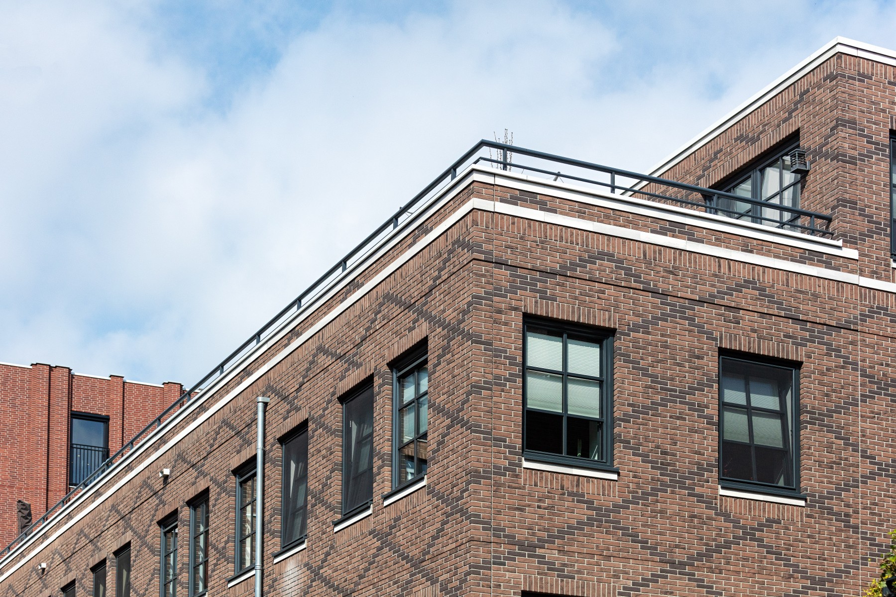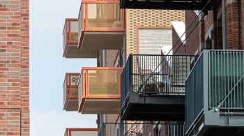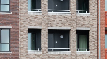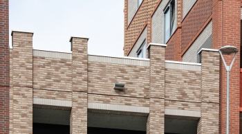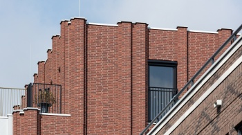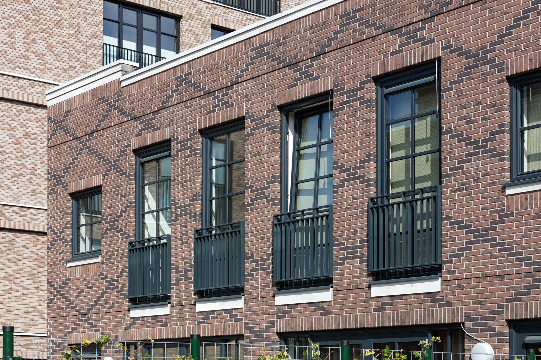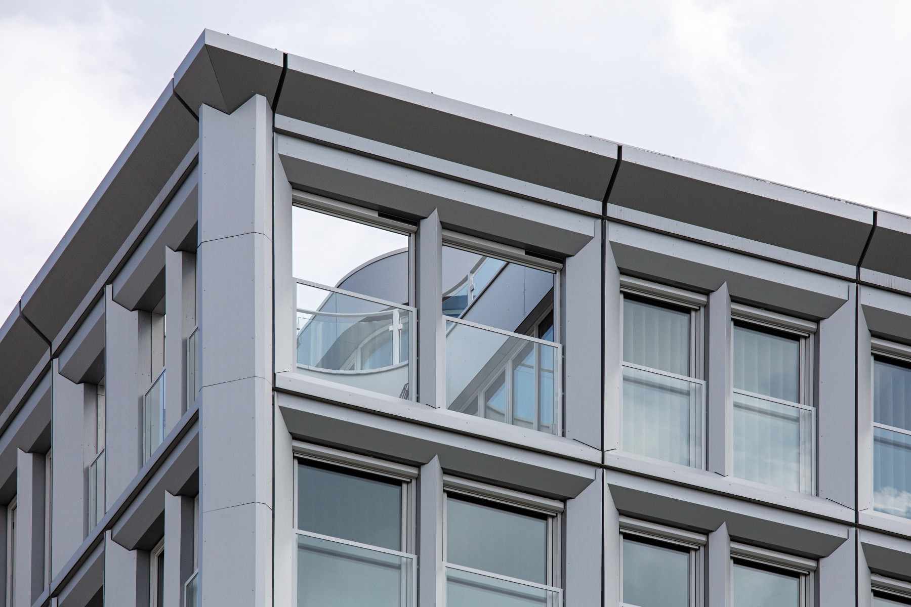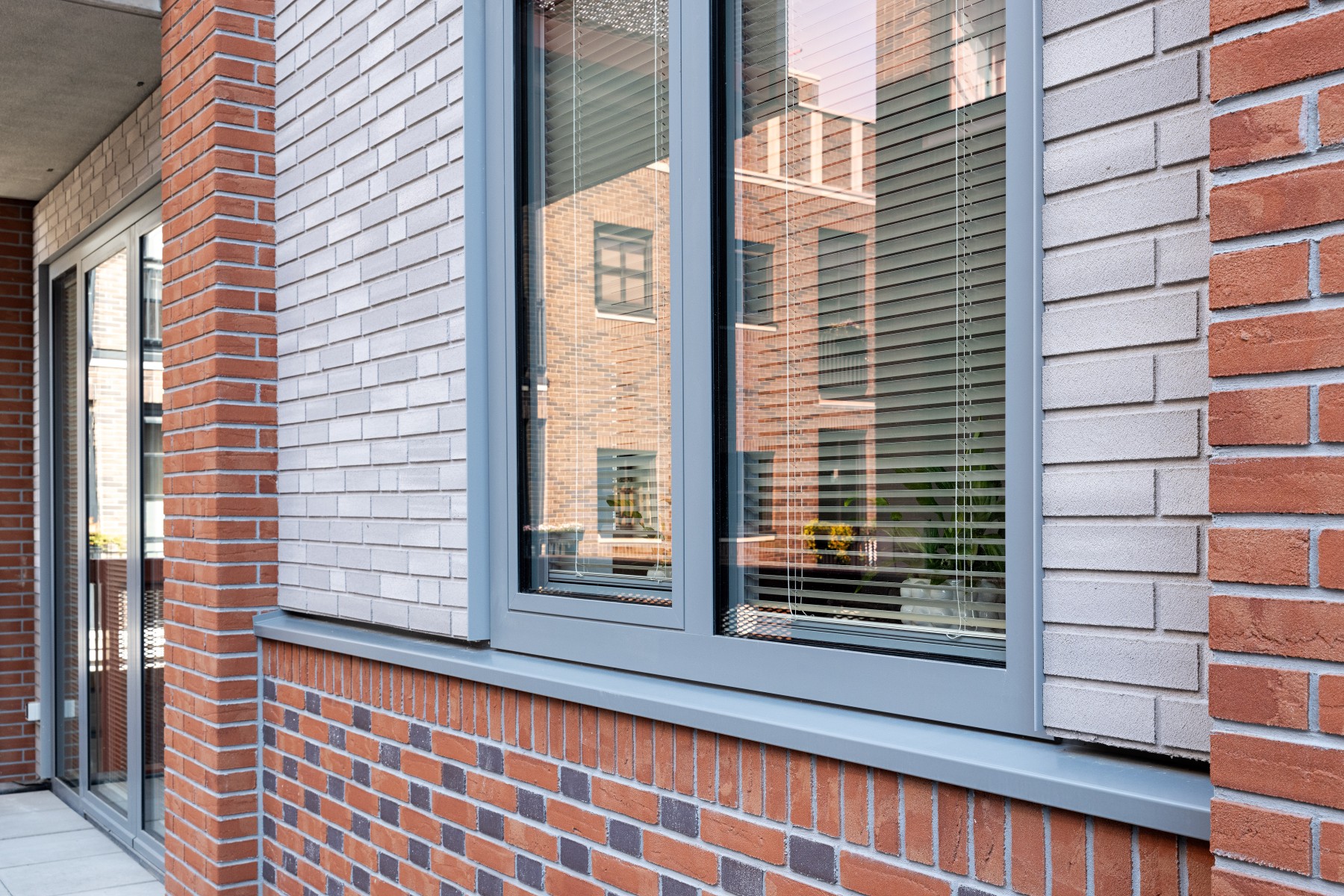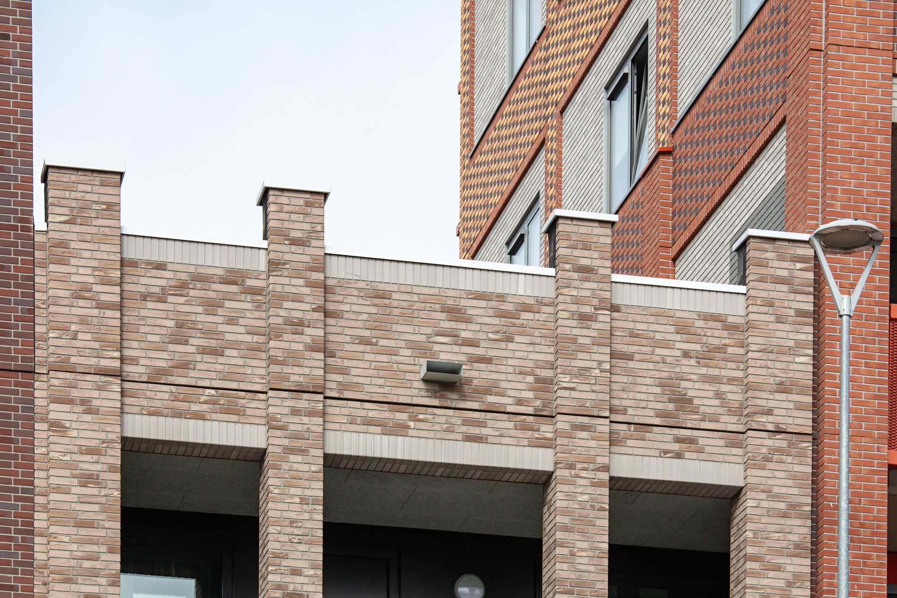 Für die Wasserschläge und Mauerabdeckkappen wählte Joost bewusst Aluminium wegen der Leichtigkeit, mit der das Material detailliert werden kann. Die Aluminium-Mauerabdeckkappen sind an einigen Stellen mit Balustern mit Geländer versehen, manchmal drei übereinander. „Aluminium-Mauerabdeckkappen sorgen für eine saubere Oberfläche an Rändern, an denen Bewohner nah herankommen, wie Balkone und Dachterrassen. Hier ist Aluminium nicht nur ästhetisch ansprechend, sondern auch praktisch durch seine Langlebigkeit und einfache Wartung. Darüber hinaus konnten wir hiermit dennoch ein Bild traditioneller Betonarchitektur auf leichte und innovative Weise umsetzen, passend zur Holzrahmen-Bauweise“, so Verbeek. Zusätzlich hat Aluminium geholfen, horizontale Nähte zwischen Fassadenpaneelen zu kaschieren. „Durch die geschickte Anwendung von Aluminium-Kantteilen verschwinden hier und da Nähte gezielt im Design.“
