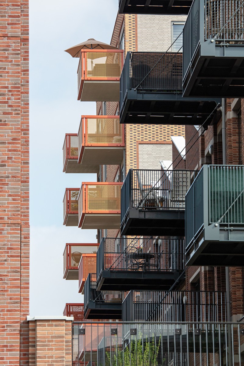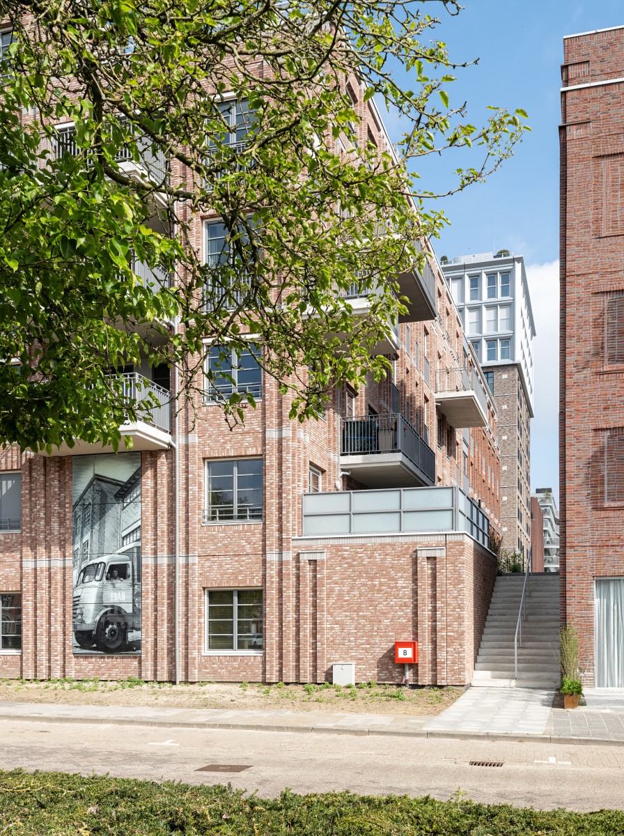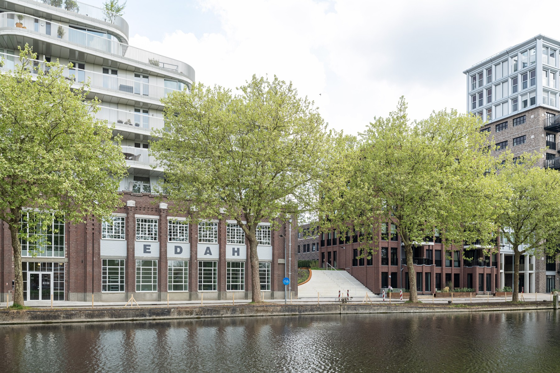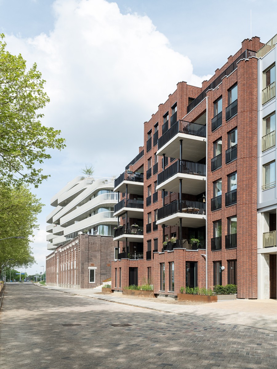Der Wohnkomplex besteht aus dreizehn Wohnblöcken, die zusammen eine klare Einheit bilden, aber dennoch jeder einen eigenen Charakter besitzt. „Wir haben uns um Variation innerhalb der Kohärenz bemüht“, bemerkt Verbeek. „Die Breitenmaße der Wohngebäude am Kanal sind nahezu gleich und inspiriert von der Breite des monumentalen EDAH-Gebäudes. Das sorgt für Rhythmus und Wiedererkennbarkeit.“
