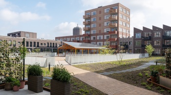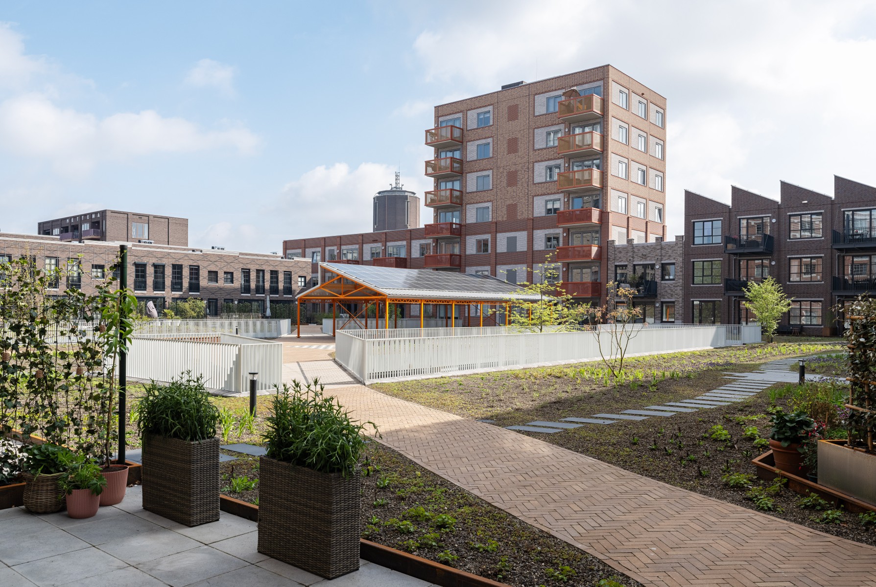 Die Oranjekade zählt 269 Wohnungen, von kompakten Apartments mit 40 m² bis hin zu großzügigen Wohnungen mit 200 m². Dies sorgt für ein vielfältiges Publikum und stärkt das Gemeinschaftsgefühl. Joost: „Wir wollten wirklich ein Viertel schaffen, in dem Menschen zusammenleben.“ Ein auffälliges Detail sind die zentralen Innenbereiche, Dachgärten, unter denen sich die Parkeinrichtung befindet. Einer dieser Dachgärten hat eine Überdachung aus wiederverwendeten Fachwerkträgern aus dem monumentalen Gebäude. „Bewohner können hier Aktivitäten organisieren und einander treffen, was zu einer lebendigen Gemeinschaft beiträgt.“