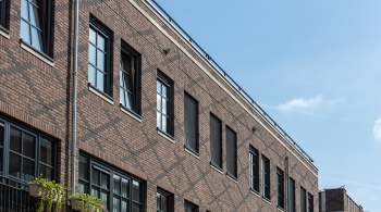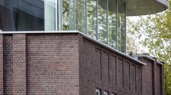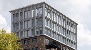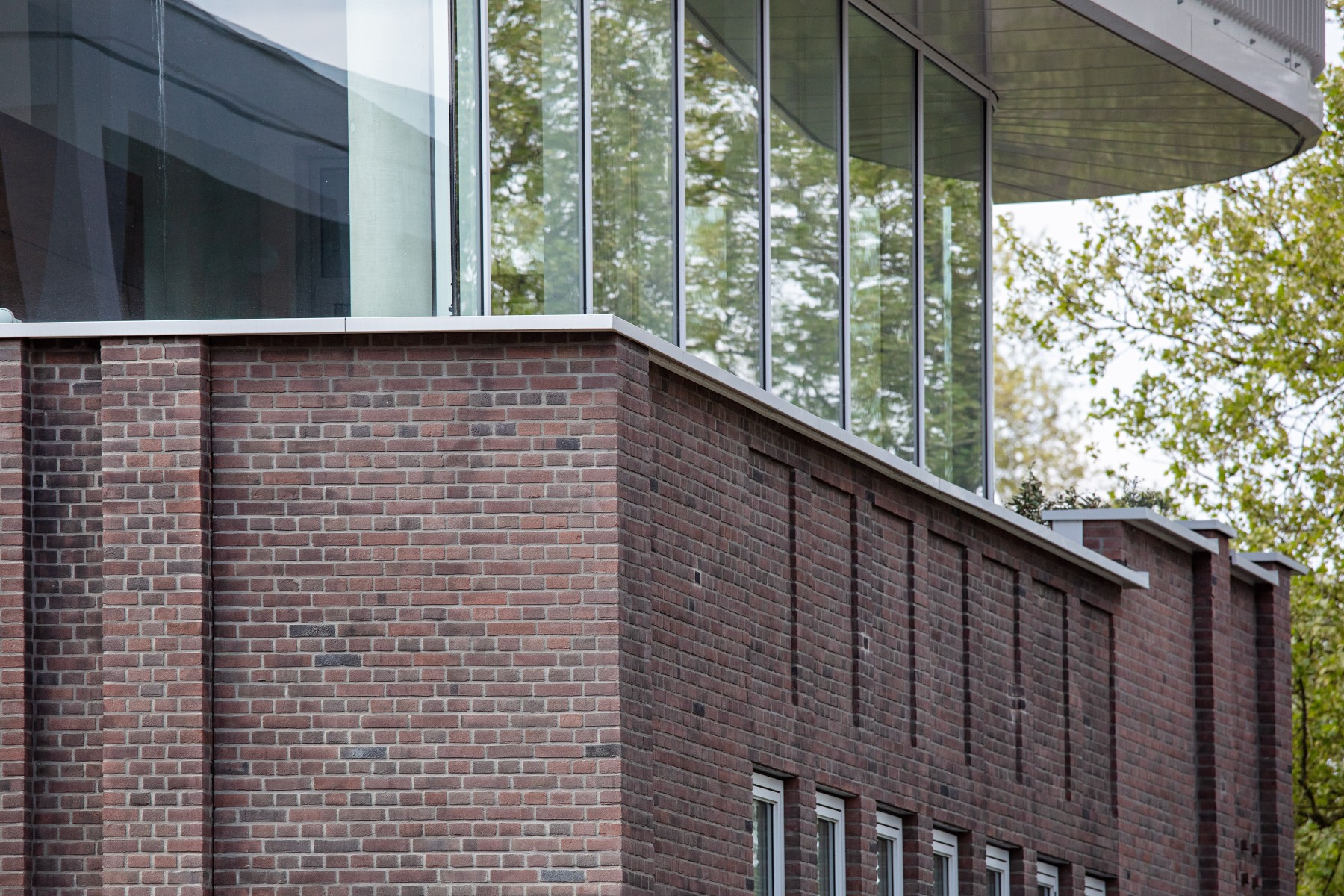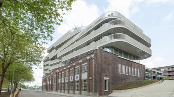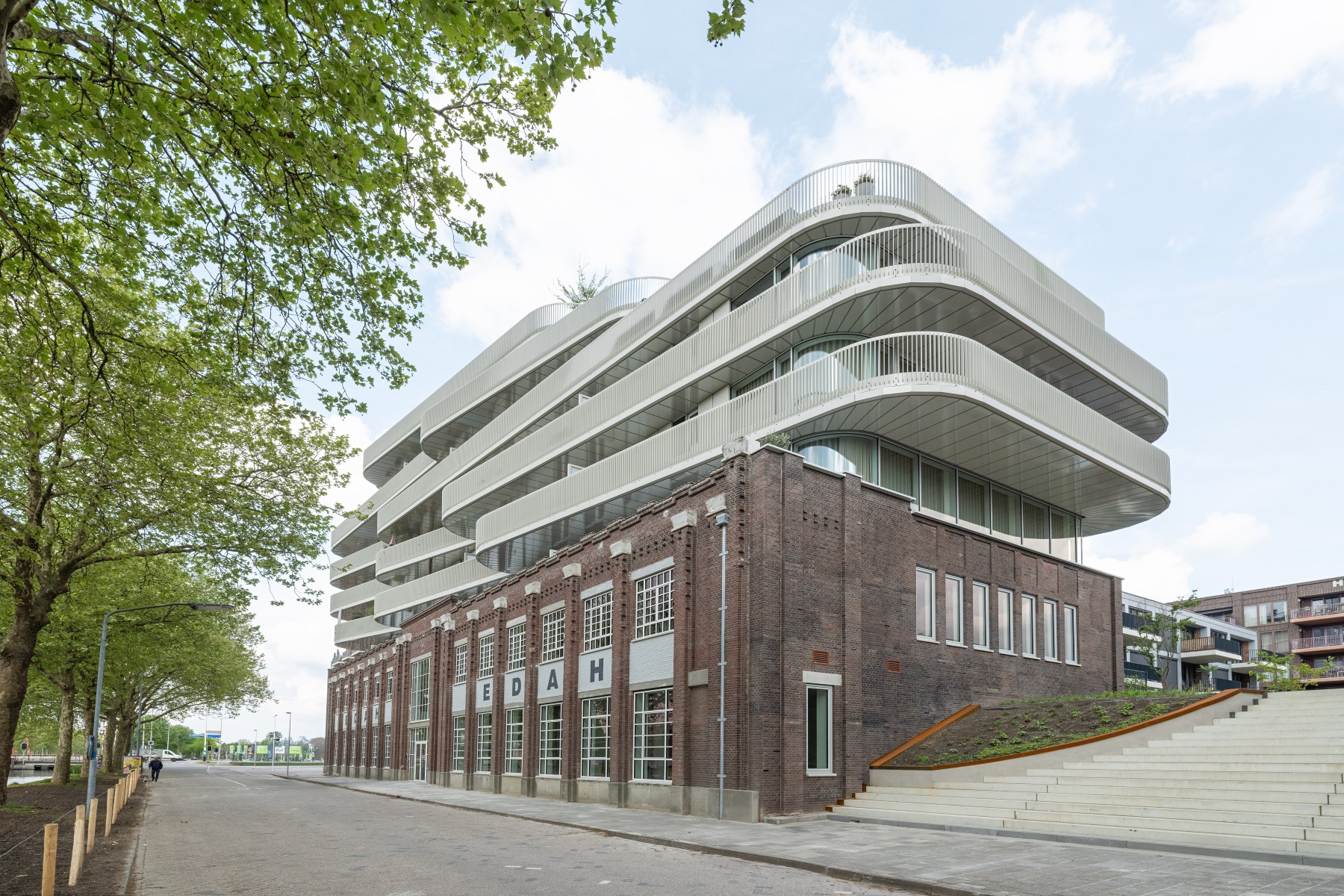 Die monumentale Fassade des EDAH-Gebäudes selbst wurde sorgfältig wiederhergestellt. Das gesamte Gebäude wurde mit einer modernen, auffälligen Aufstockung versehen. „Historische Elemente wie Fensterrahmen wurden im ursprünglichen Charakter in Aluminium ausgeführt, während wir mit der Aufstockung etwas Neues hinzufügen wollten“, sagt der Architekt. Die runden Formen dieser Ergänzung, die an den Bug eines Schiffes erinnern, sind inspiriert vom nahegelegenen Kanal und der nautischen Vergangenheit des Standorts.“