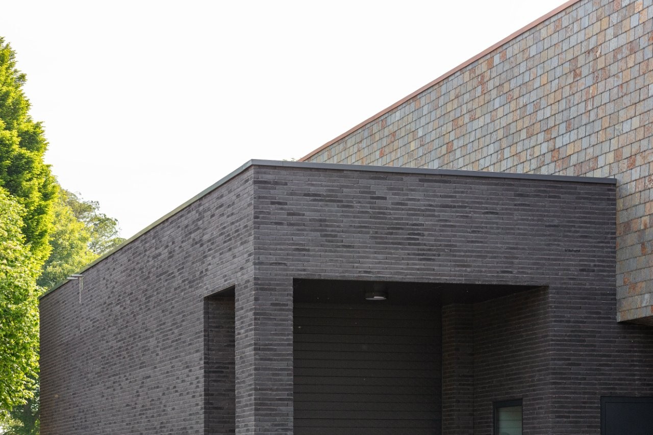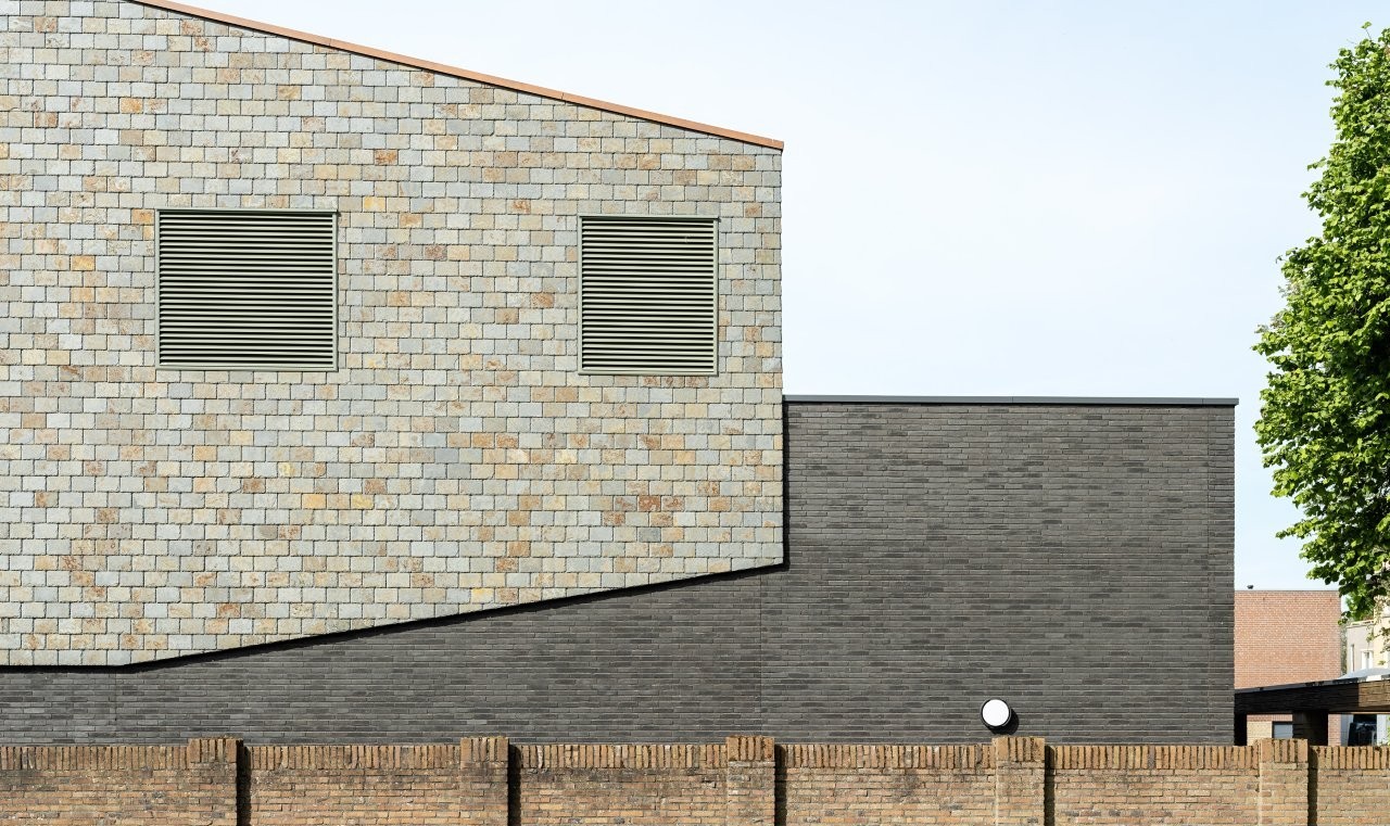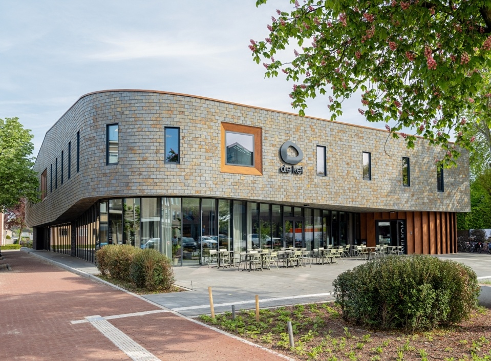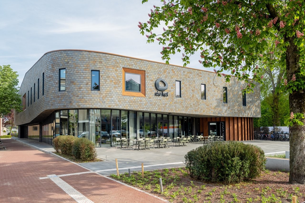 Die alte Kei musste ersetzt werden. Veraltet, wenig Komfort und eine unpraktische Wegeführung. Dennoch hing Emotion daran, besonders bei den älteren Einwohnern von Reusel. Die Herausforderung für Keeris lag darin, etwas Neues zu bauen, das sich vertraut anfühlt, aber den Anforderungen dieser Zeit entspricht. „Wir wollten ein Gebäude, das Substanz hat. Keine anonyme Kiste, sondern eine charakteristische Kei, die den Platz umarmt. Robust und gleichzeitig zugänglich.“ Der Standort, mitten im Dorfzentrum, erforderte eine Geste. Nicht aufdringlich, sondern selbstbewusst. Die transparente Sockelzone am Kirchplatz sorgt dafür, dass das Gebäude „mit dem Platz atmet“. „Das Foyer öffnet sich zur Umgebung. Man sieht, was drinnen passiert. Es lädt ein.“ Das Obergeschoss ist geschlossen, massiv. Ausgeführt in Schiefer, in dunklen Tönen, die an das Kambrium erinnern. Genau wie der echte Findling aus dem Wald.