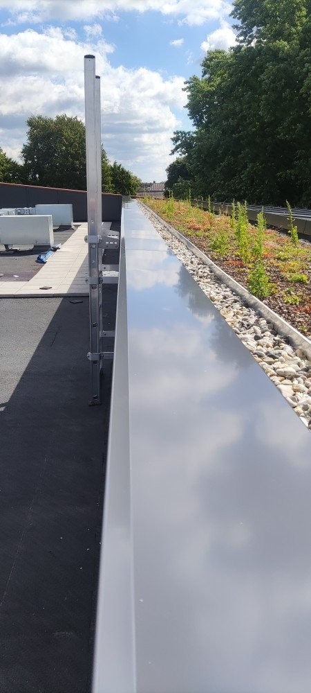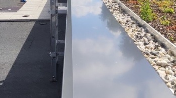Das Dach ist mit Aluminium- Mauerabdeckungen abgeschlossen. Die Detaillierung des Gebäudes ist raffiniert, was gut zur Wahl der Aluminium-Detaillierung passt. Eine bewusste Wahl, betont Keeris: „Wir wollten scharfe Linien, eine starke Profilierung und Material, das schön bleibt ohne Aufwand. Aluminium ist dann eigentlich selbstverständlich, es ist außerdem formbar.“ Die Aluminium- Mauerabdeckungen schließen nahtlos an das architektonische Bild der Kei an. Sie folgen den schrägen Linien des Gebäudes und sorgen für einen ruhigen Abschluss der Fassaden. Die Maßanfertigung in Aluminium war entscheidend bei der Ausführung der runden Formen und der scharfen Ecken. „Gerade beim Theaterteil und dem Eingang haben wir den Handwerkern das Äußerste abverlangt. Dann ist es gut, wenn man mit Materialien arbeitet, die sich biegen, ohne an Qualität einzubüßen.“