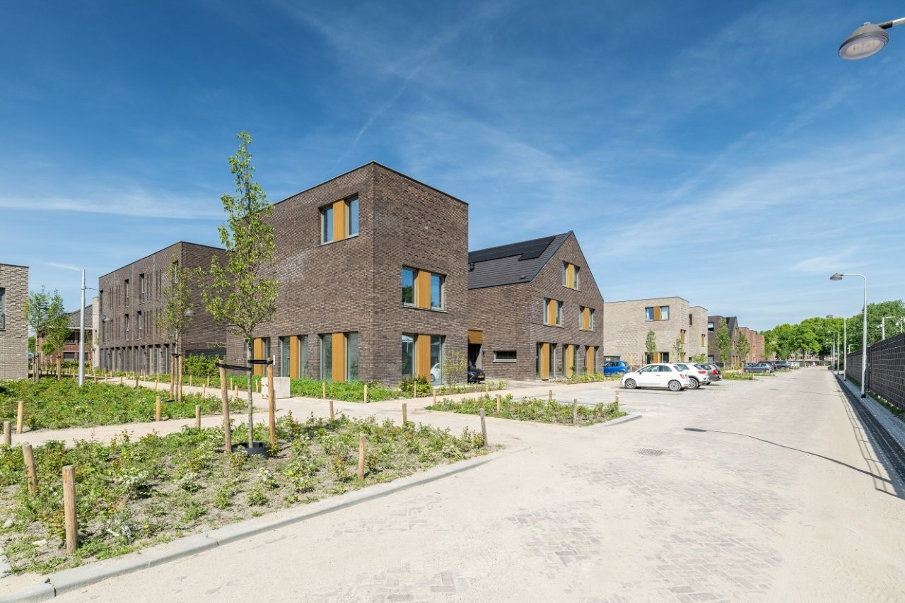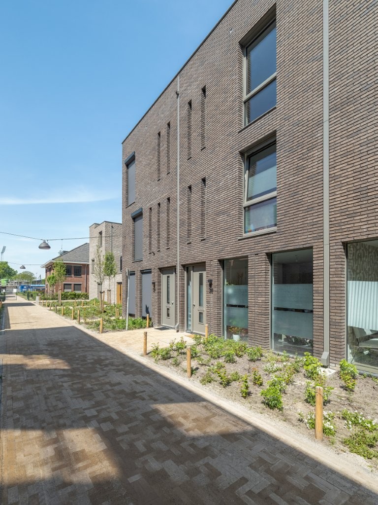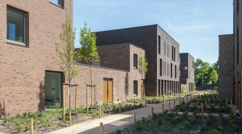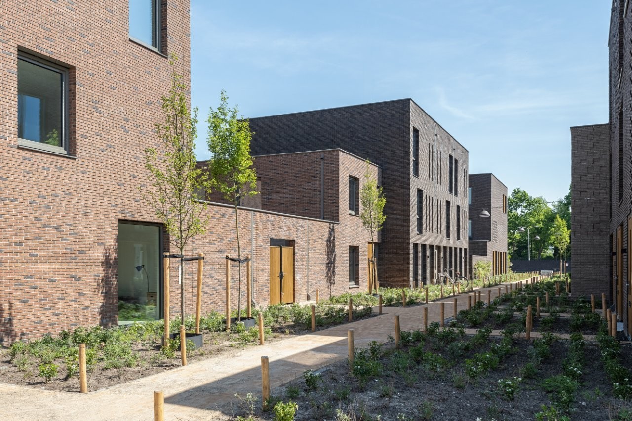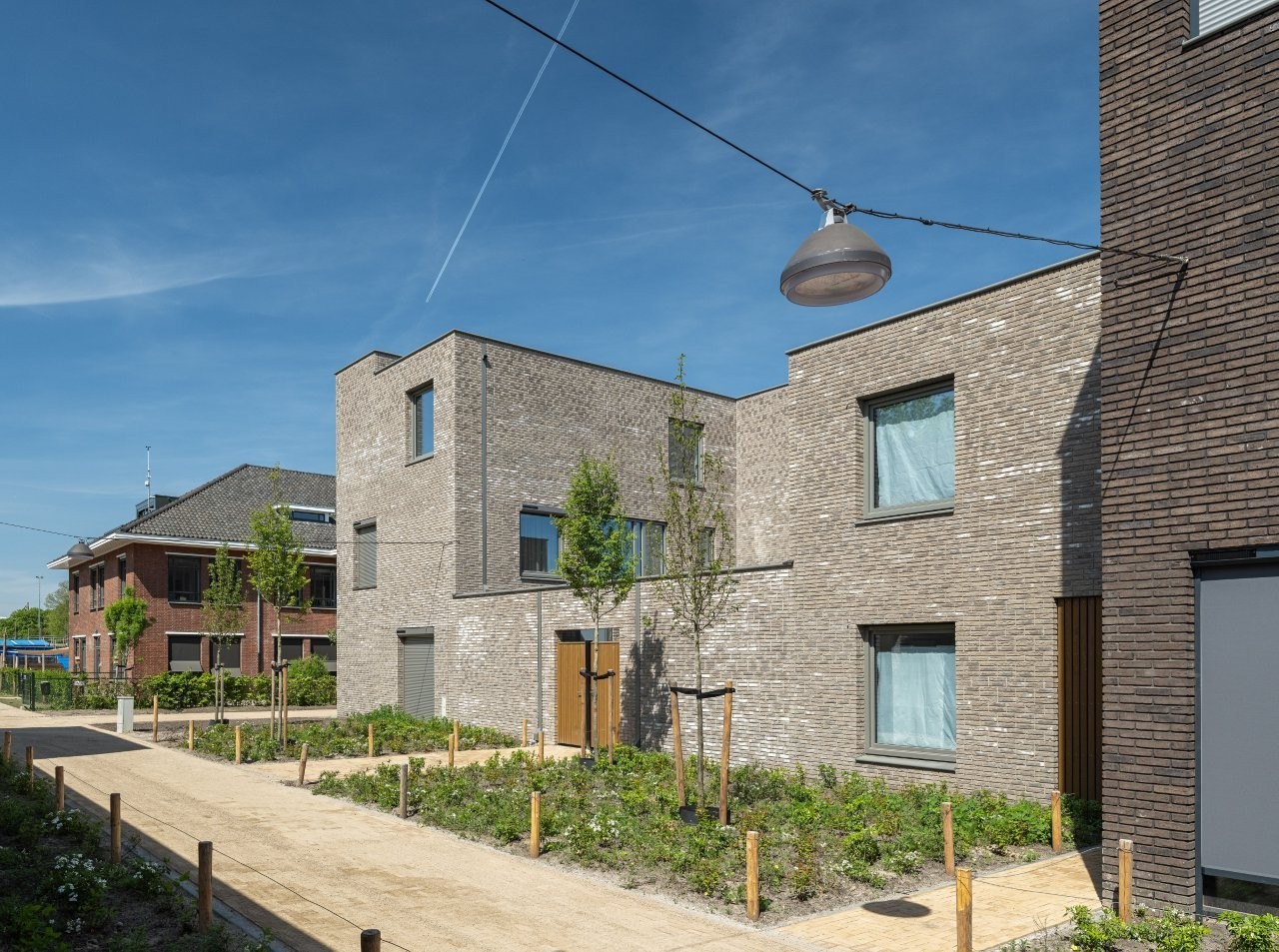 Das Viertel weist ein auffallend gemischtes Programm auf: ebenerdige Eigentumswohnungen, Apartments, soziale Mietwohnungen, eine Grundschule, eine Kindertagesstätte und Pflegeheime. „Diese Funktionsmischung war von Anfang an ein wichtiger Ausgangspunkt. Das spiegelt sich auch in den Grundrissen, der Lage der Gebäude und der Wegeführung wider“, erklärt Van der Hamsvoord. Trotz dieser funktionalen Vielfalt wirkt das Gebiet besonders ruhig. Das liegt an der cleveren Gestaltung des öffentlichen Raums. „Der zentrale Bereich ist vollständig autofrei. Das Parken erfolgt an den Rändern des Gebiets oder halb tiefergelegt unter einigen Apartment- Gebäuden. Dadurch gibt es viel Spielfläche und Raum für Erholung.“