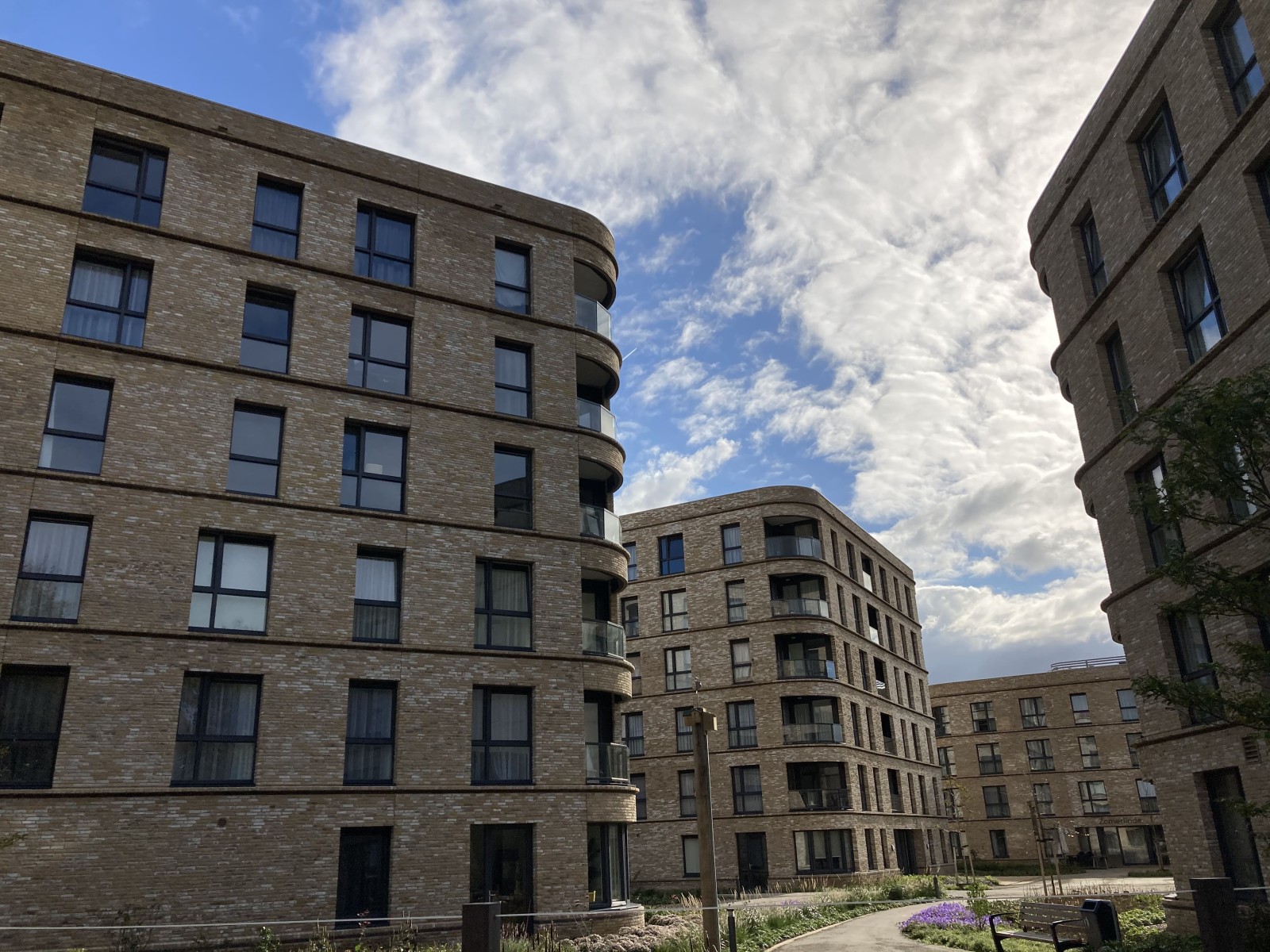 Der Garten ist deshalb nicht Nebensache, sondern ein wesentlicher, zentraler Teil des Wohnerlebens. Die Architektur ist dem untergeordnet, jedoch ausgesprochen funktional im Verhältnis zum Umfeld. Der Architekt verpasste den Gebäuden zum Beispiel abgerundete Ecken. Zusammen mit der gedrehten Anordnung der Wohnblöcke entsteht so nicht nur eine dynamische Linienführung, die Bewohner haben auch mehr Durchblick. Die Räumlichkeit wird zusätzlich betont dadurch, dass der Garten zwischen den Gebäuden und darum herum offen ist, also zugänglich. Anstelle von hohen Zäunen trennen die sechzig Zentimeter hohen, aber langgezogenen Mäuerchen öffentlichen und privaten Raum auf eine viel natürlichere Weise. Außerdem sind die Mäuerchen auch eine super Sitzfläche.