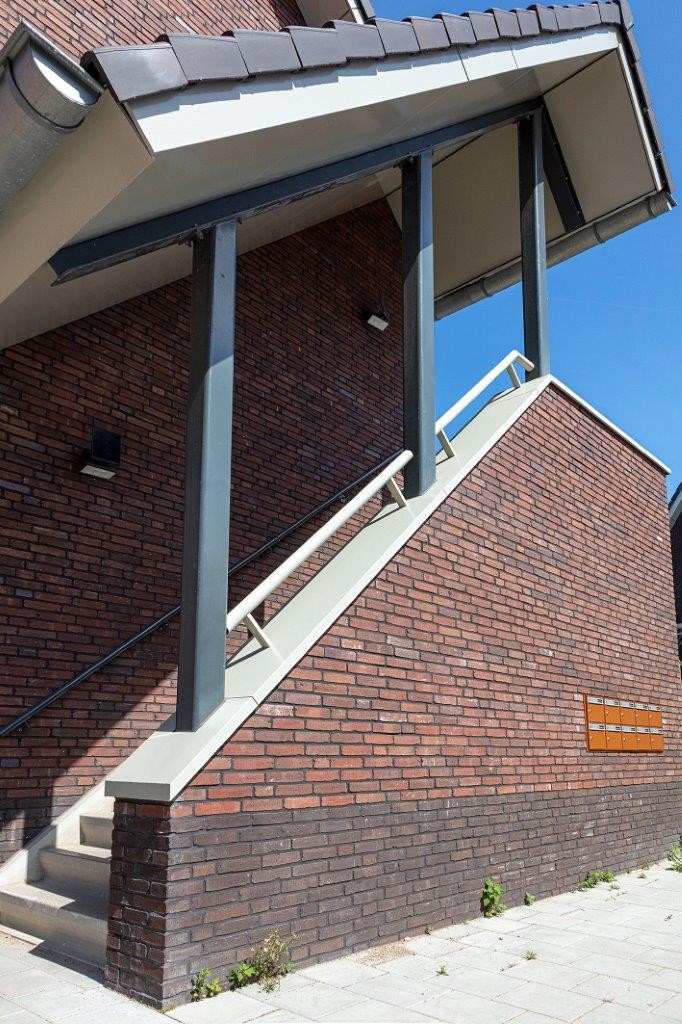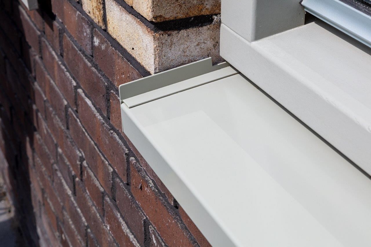 Die Materialwahl spielt eine wichtige Rolle für das Erleben, die ästhetische Ausstrahlung eines Gebäudes. Bei Baudetails aus Aluminium kommt zudem noch ein funktionaler Aspekt hinzu. Van der Kroft entschied sich bewusst für Mauerabdeckungen aus Aluminium mit oder ohne verdeckt befestigte Aluminiumgeländer: „Auch wegen der guten Dämmung und Entwässerung. Außerdem haben wir Aluminium-Dachrandprofile verwendet. Diese kontrastieren schön mit den verschieden Klinkerfarben. In anderen Fällen stellen die Aluminium-Dachrandprofile eine Verbindung zwischen Holz und Stein her. An den Erkern der freistehenden Einfamilienhäuser und Eckhäuser sind die Dachränder in der Farbe der Klinkerfassade ausgeführt. Ebenso die Aluminium-Fensterbänke. Das sorgt für ein ruhigeres Gesamtbild. Ein großer Vorteil bei Mauerabdeckungen, Dachrandprofilen und Fensterbänken aus Aluminium ist, dass das Wasser ordentlich abgeleitet wird. So entstehen keine hässlichen Schmutzwassersteifen an der Fassade."
